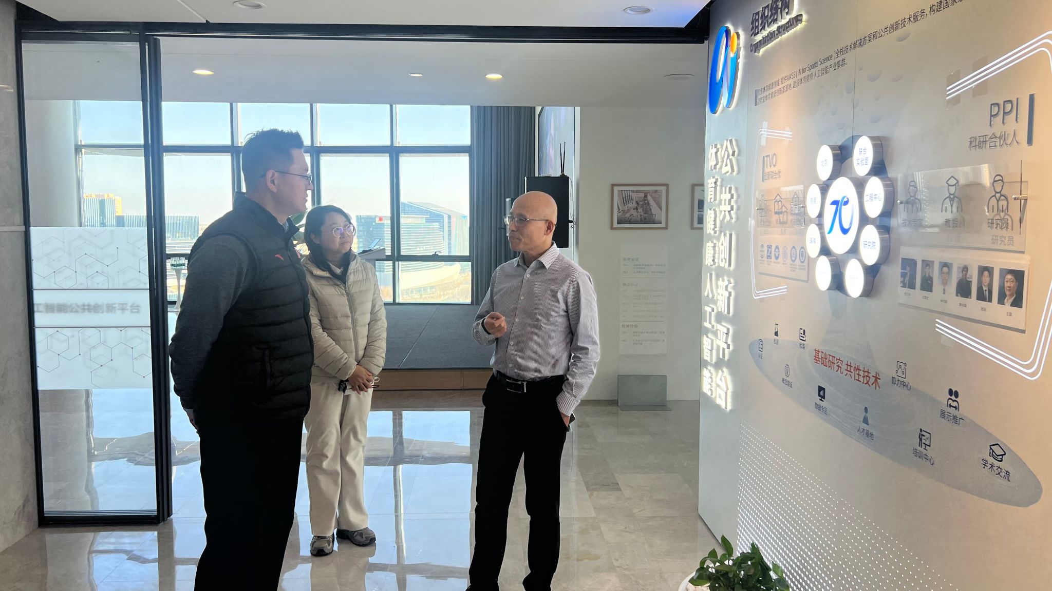 23日下午,调研团来到本次行程最后一站——国家体育总局智慧体育技术创新中心。中心主任李祥臣教授对调研团一行表示热烈欢迎,并引导大家参观了体育健康人工智能创新平台。该平台整合国内智慧体育领域前沿技术与科研资源,集中展示了智慧体育相关创新成果与应用场景。在随后的座谈会上,双方围绕智慧体育科研方向及平台协同机制等进行了深度交流。